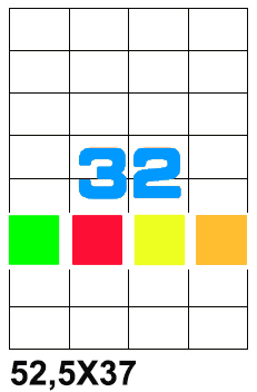 Etichette 52¸5x37 mm in Carta FLUORESCENTE Verde-Rosso-Giallo-Arancio Adesivo Permanente su Fogli A4. La scelta del colore FLUO va indicata nelle note dell`ordine.