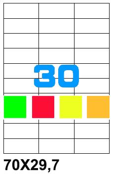 Etichette 70x29¸7 mm in Carta FLUORESCENTE Verde-Rosso-Giallo-Arancio Adesivo Permanente su Fogli A4. La scelta del colore FLUO va indicata nelle note dell`ordine.